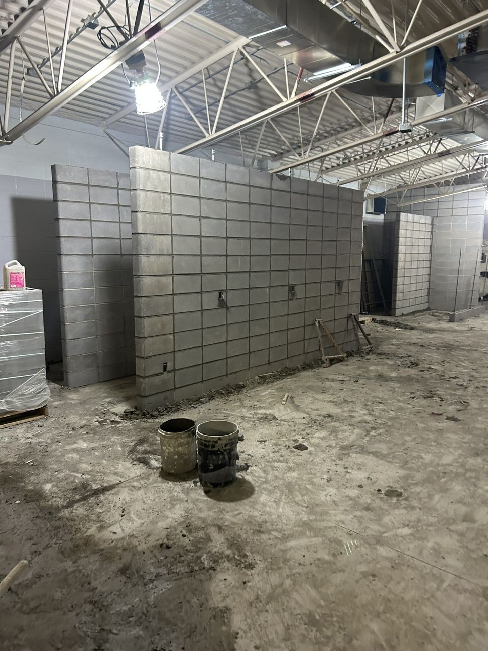 - 8 ft (96”) block walls with open ceiling for airflow and sound control.