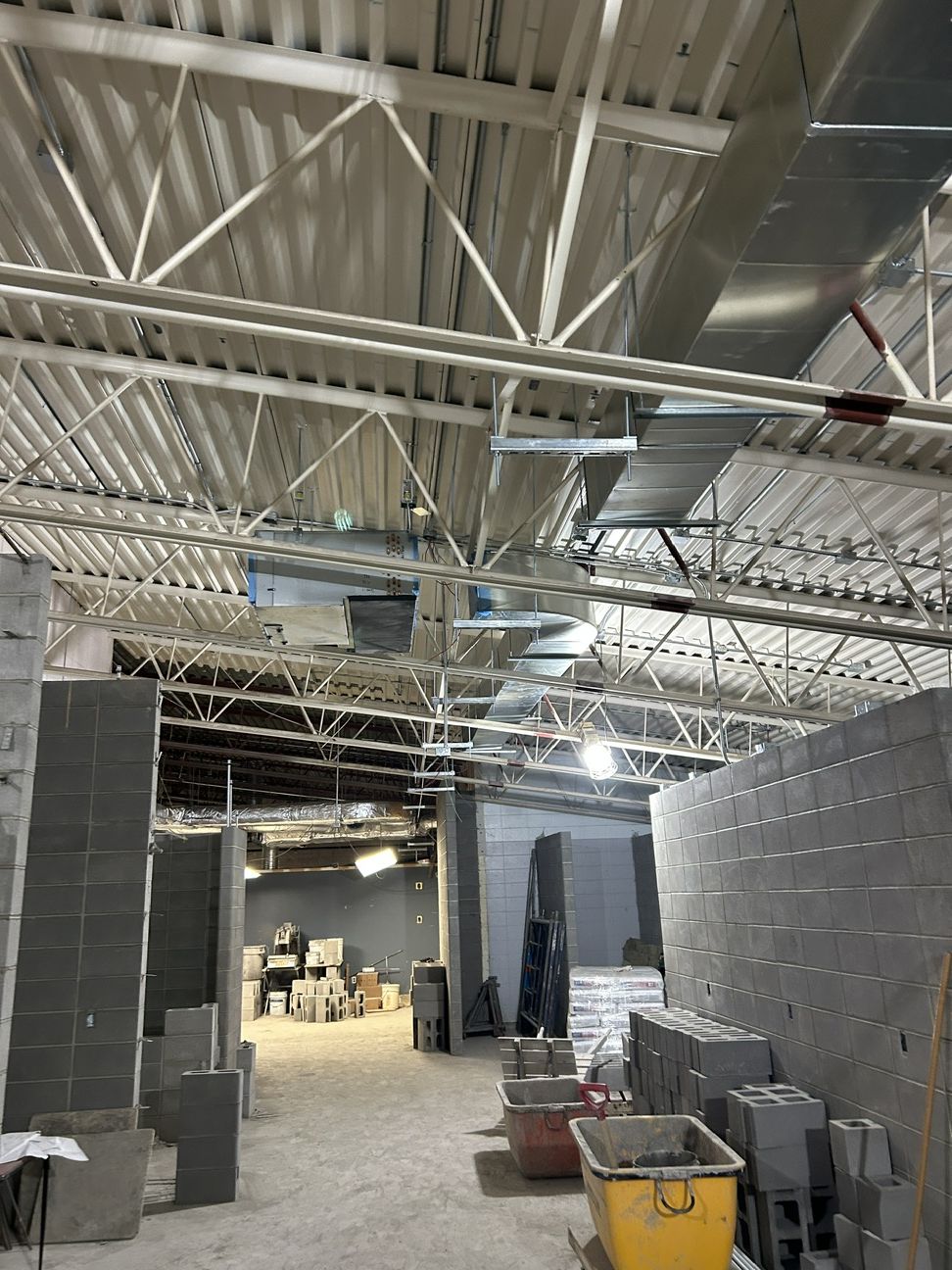 - Mechanical is working on the change room water and venting lines, ducting for reception, ducting through change rooms, as well as installing and setting Make Up Air unit