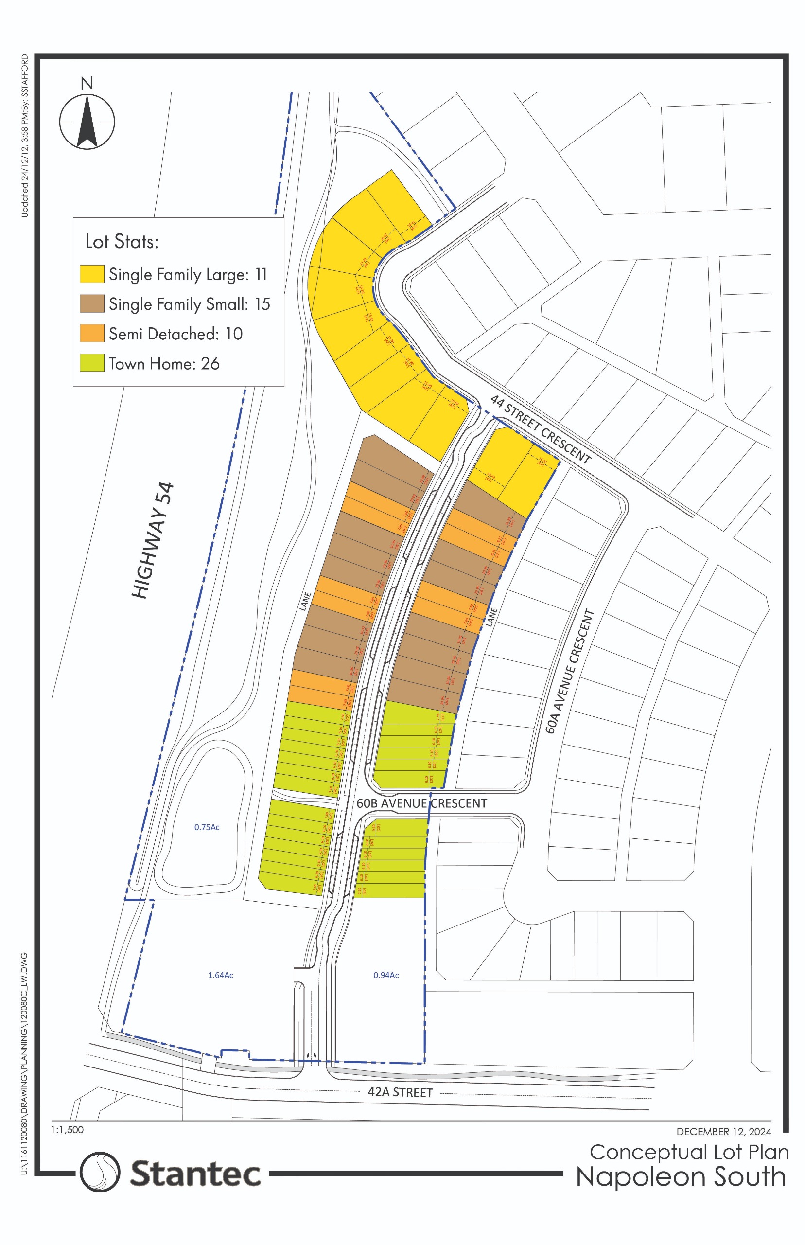 The Napoleon South land development is located south of Napoleon Lake, between Highway 54 and 60A Avenue Crescent. The project includes a mix of detached, duplex, and townhome lots. Planning and approvals were passed by Council in April 2025, and construction of homes is estimated to begin in February 2026.